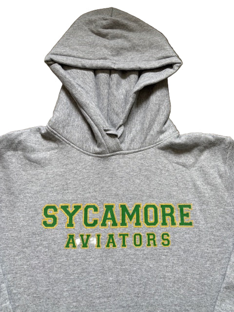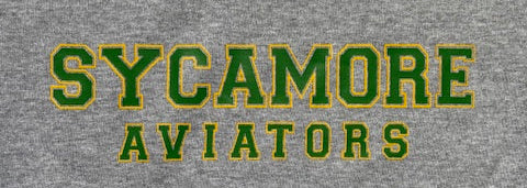 Heathered grey crewneck with Sycamore Aviators across chest.
