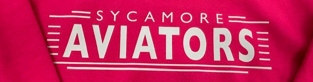 Ladies fuchsia pink hoodie with seafoam green Sycamore Aviators Design.